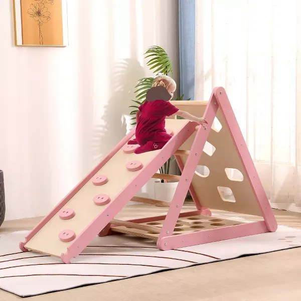 - Adorably Designed with Safety in Mind – With its slanted climbing area equipped with wooden pink grips for secure handholds and footholds, this climbing gym is not only safe but also irresistibly cute. Turn the climbing wall over and it becomes a smooth slide. All sides can be used for a variety of climbing scenarios. The entire frame is hand-painted in a soft pink hue, complemented by matching stepping stones, making it a delightful addition to any room’s decor.